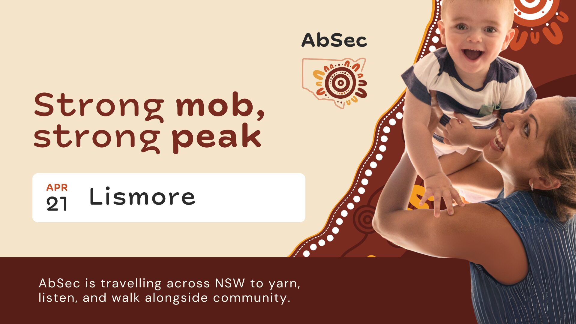 AbSec will be visiting Lismore as part of our Community Roadshow, bringing together community members, ACCOs, Local Aboriginal Land Councils and Aboriginal service providers for a morning of connection, conversation and shared learning.